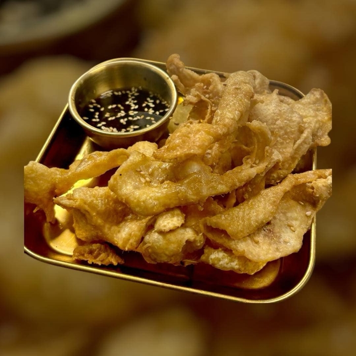 Crispy fried chicken skins with your choice of house sauces